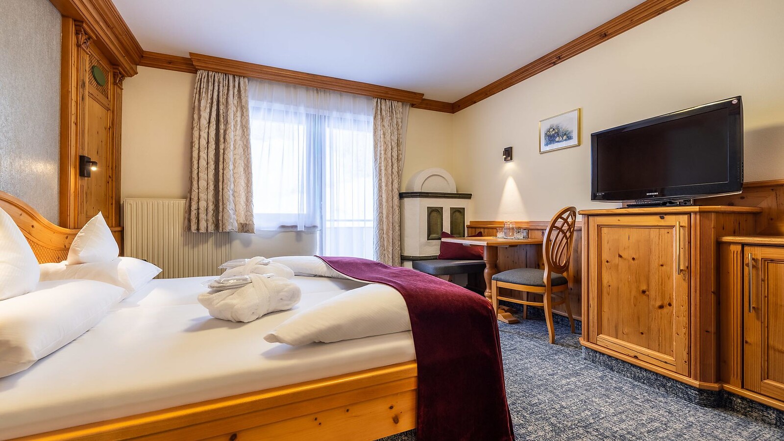 This Category 2 double room is approximately 23 m² in size and features a well-maintained reclaimed wood look. Here, the charm of bygone times meets today’s luxury. It is equipped with a bathroom with shower and separate toilet, balcony, cable TV, telephone, hairdryer, safe, tiled stove, and free Wi-Fi. Some rooms have sloping ceilings.